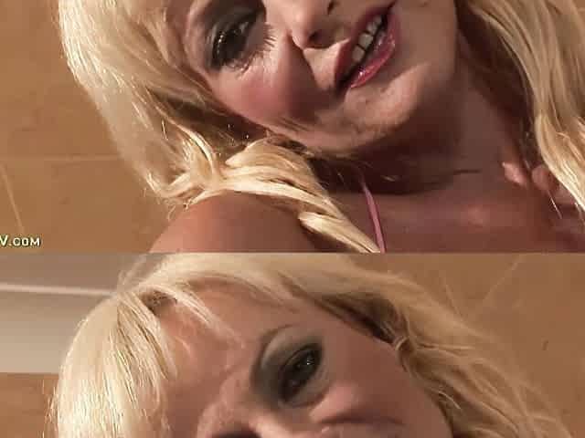 Kinky blonde babe Oprah stripping and peeing all over herself
