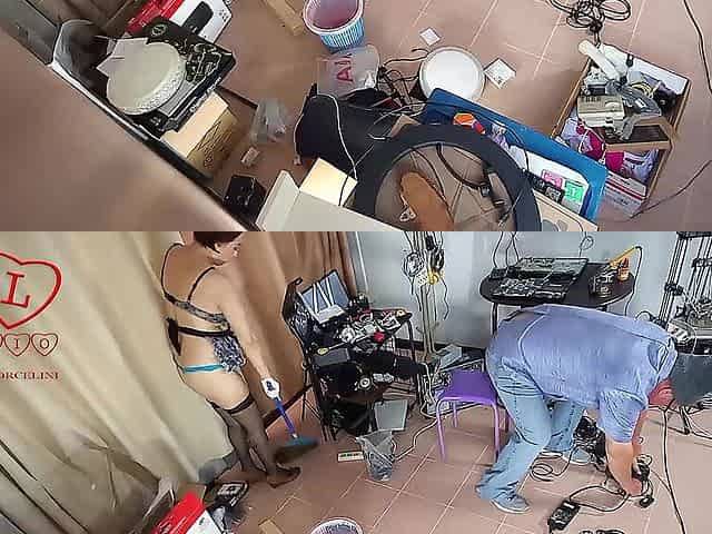 A naked maid is cleaning up in an stupid IT engineer's office. Real camera in office. Camera 4