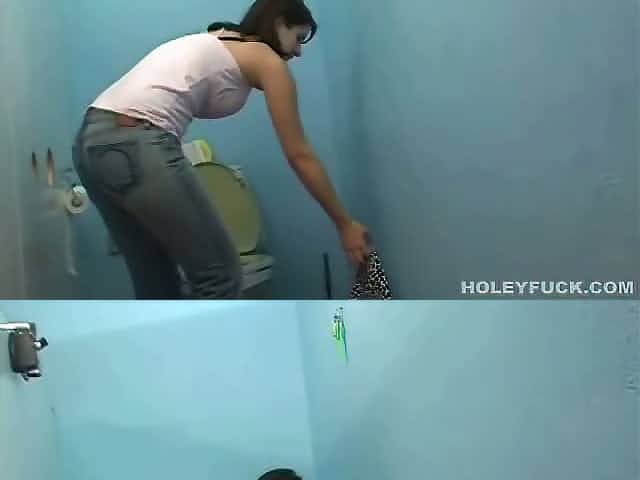 Cute blondie sits naked on the toilet for a glory hole surprise