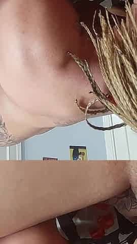 Tatted dread head swallows whilst sitting in her face