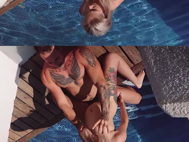 Busty tattooed teen Arteya rides cock by the swimming pool