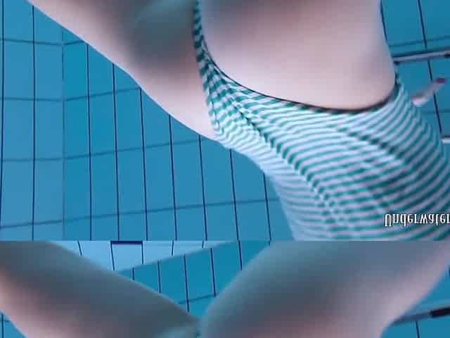 Hawt teen with petite saggy breasts swims bare in a public pool and touches a tiny jock