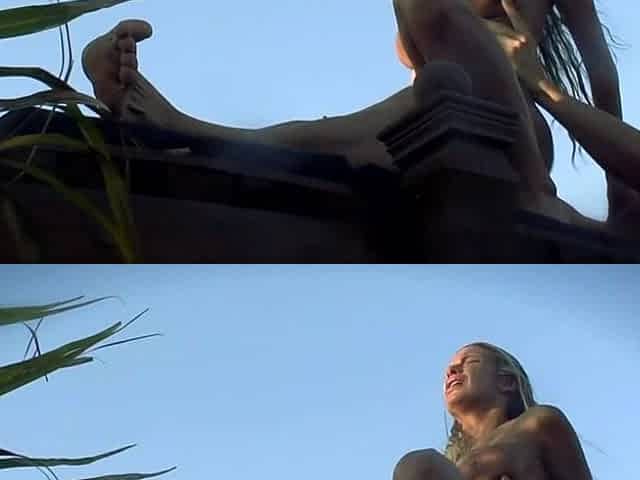 Blonde babe gets her cunt destroyed by older dude outdoor by the pool