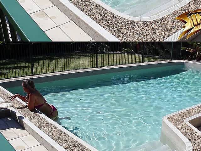 Brunette plays with a dildo by the pool then stud comes to fuck her