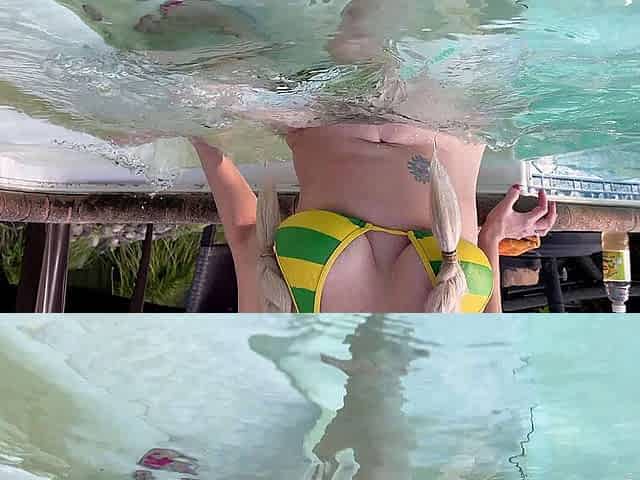 Blonde slut sucks on a lucky man's cock outside by the pool