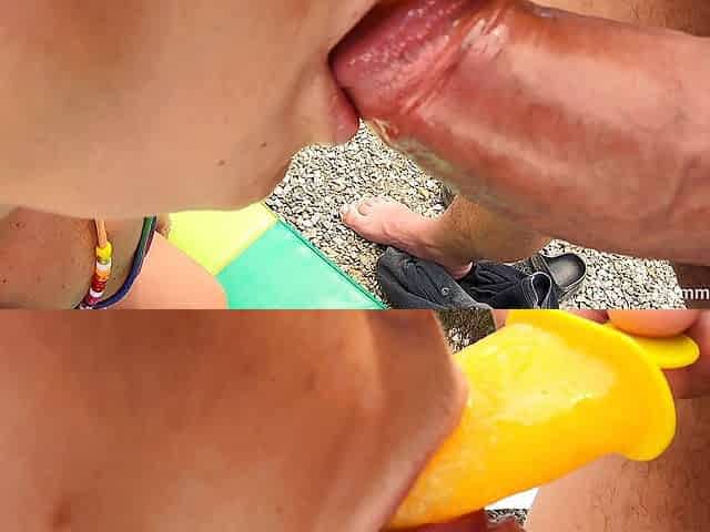 Cute teen Nicole Ray blows and deep throats outdoors
