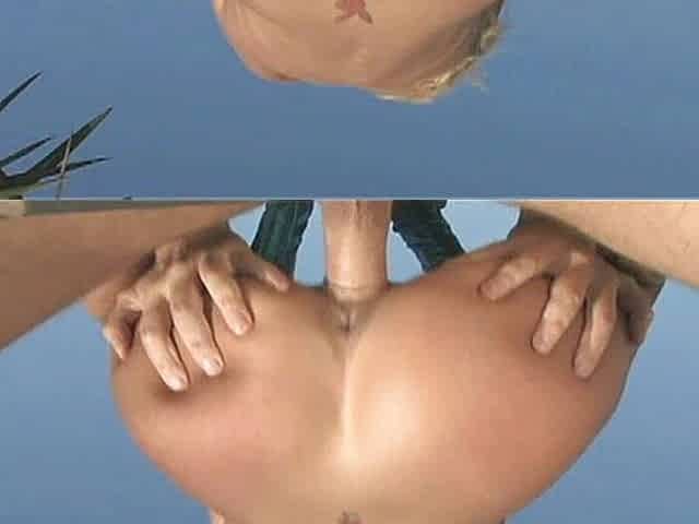 Sexy blonde gets her shaved cunt and tight ass smashed by a handsome guy outside by the pool