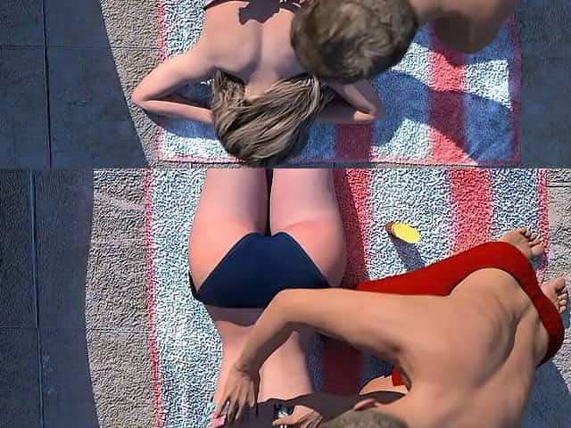 Excited chap is about to have a casual, ffm 3some next to the swimming pool