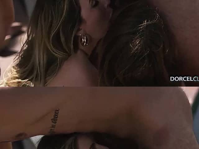 Ashley Lane and Paige Owens are making out next to the swimming pool, during a trio