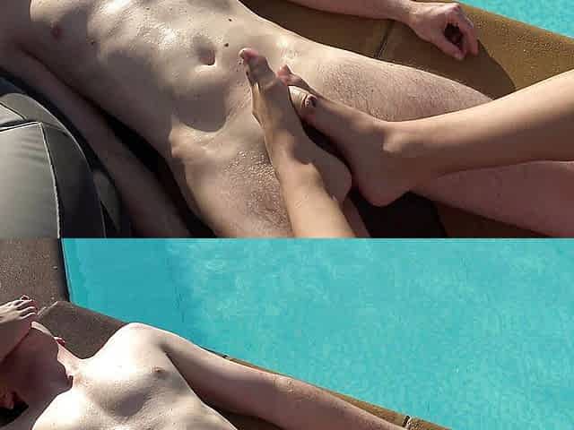 Beautiful blonde by the pool fucks a stranger's willing cock with her feet