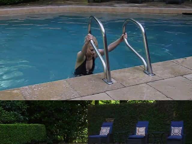 Nice bitch in a swimsuit fucks around the pool