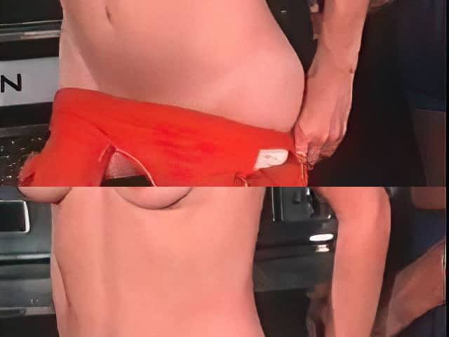 She catches you spying her sunbathing so gives strip show