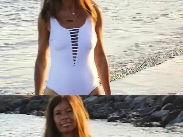 MILF exhibitionist in fishnet swimsuit outdoors on public beach