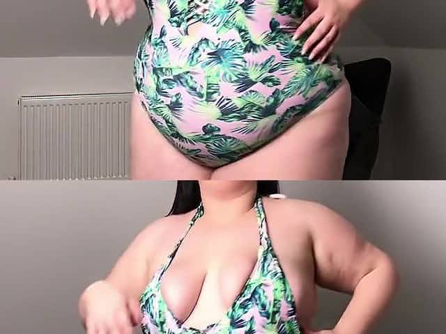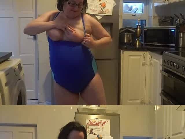 "Wife with Big Breasts Dancing in Tight Blue Swimsuit"
