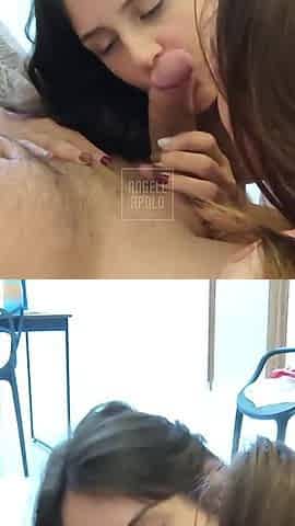 Double Blowjob - Gorgeous Breasted Girls Kissing While Sharing a Cock. FFM
