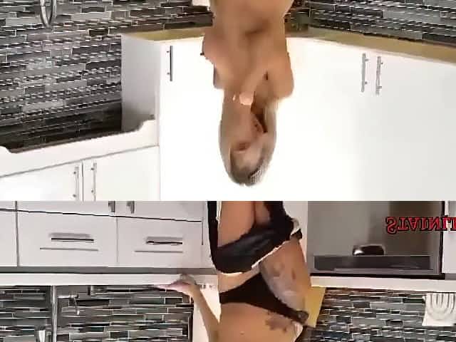 Tall golden-haired woman with large, firm melons is rubbing her juicy vagina in the kitchen