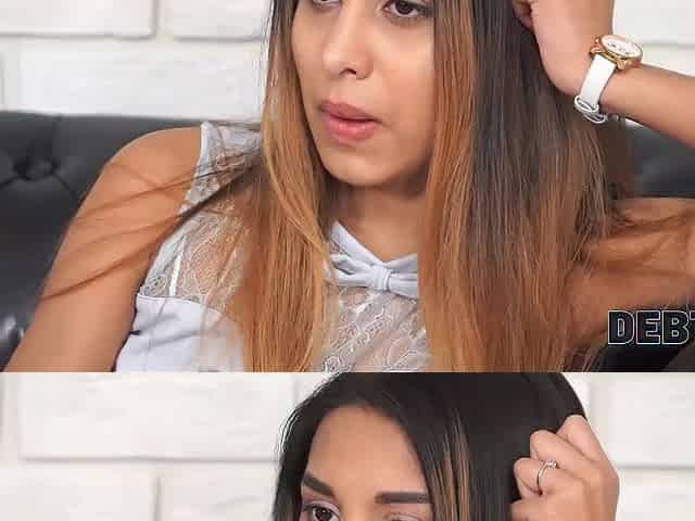 DEBT4k. Debt collector stretches tanned hottie on the leather couch