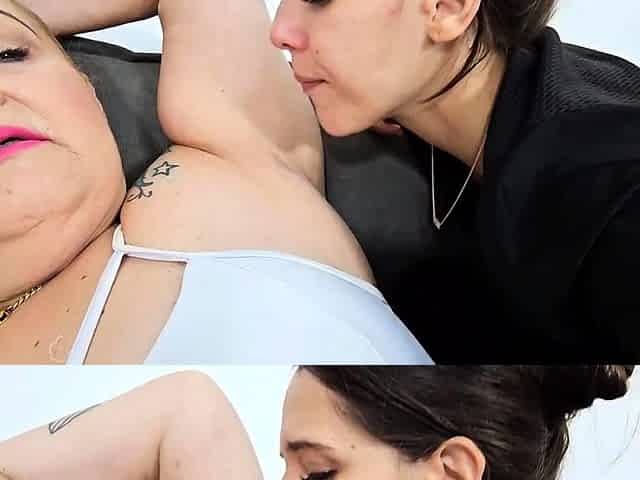 Pale blonde and tanned brunette lesbians