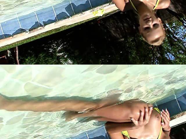 Tanned blonde goddess slips out of her yellow bikini and into the pool to play with her bald pussy