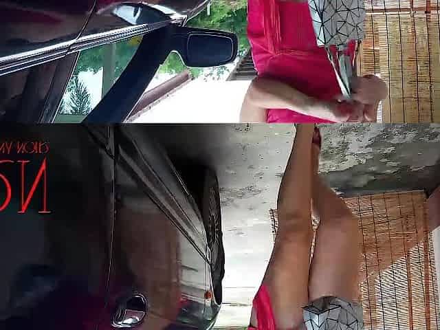 A lady masturbates in a car in a parking lot Teasing a love button with a vibrator