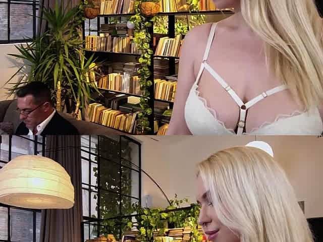 Blond playgirl Victoria White teases him with her booty