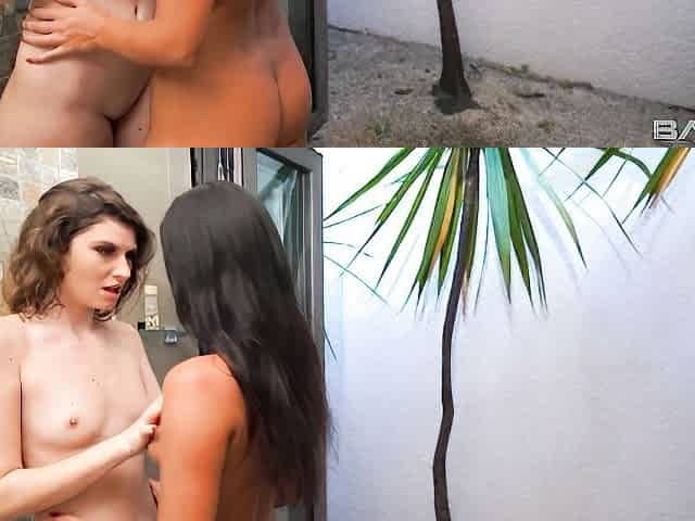 Two brunettes Ameena Green and Beca Barbie share a big boner