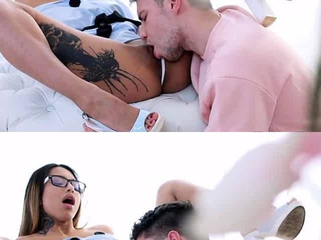 Trimmed pussy brunette Taisha fulfills her dream of having a threesome