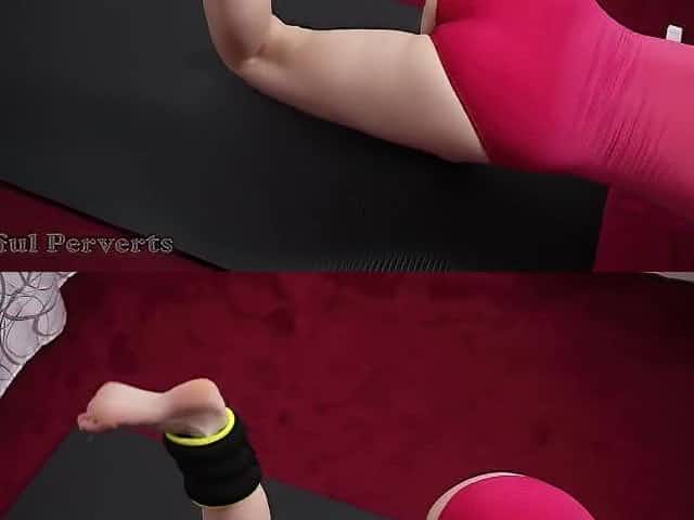 Girl In Gymnastics Leotard With Ankle Weights Working On Her Legs And Feet