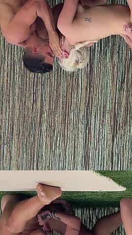 Bakstage Blonde Licks Pussy While Being Fucked by Tattooed Lover