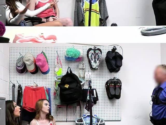Two teen shoplifters blowjob then fucked by an old officer