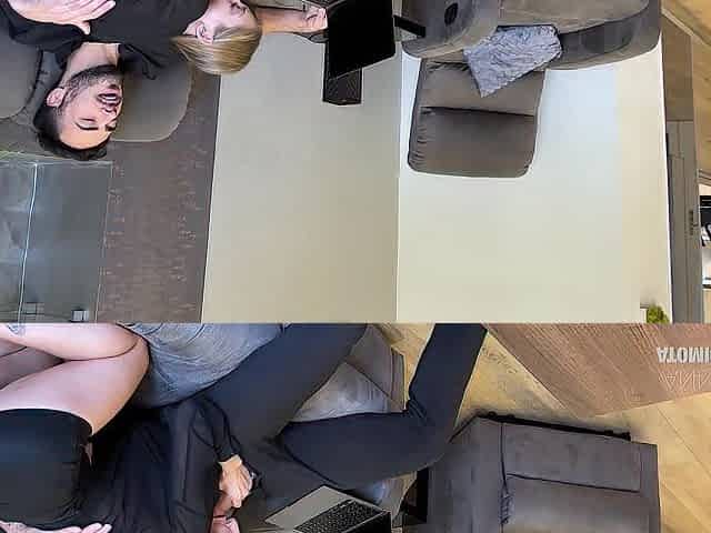 I spy my boyfriend screwing his excited coworker. Mi joins and licks the cum off her snatch