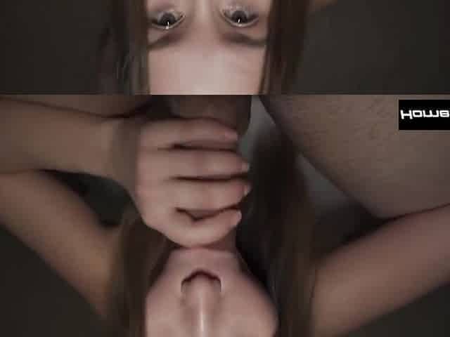 Close-up blowjob with eye contact in a schoolgirl outfit
