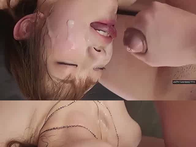 Aoi Mizuno's smooth shaven pussy gets bukkake gang bang in a Japanese scene