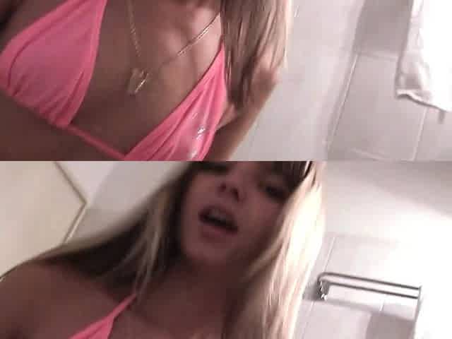 Brother-in-law ambles in on step-sister in the bath, fingering with a large dildo - sislovesme