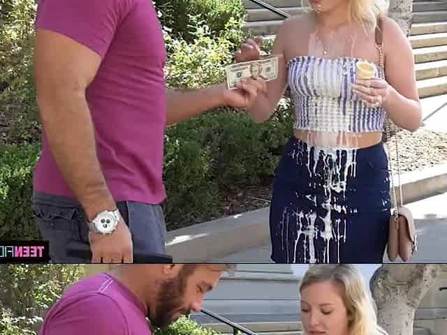 Skinny blonde teen girl Stephanie playing with big cock