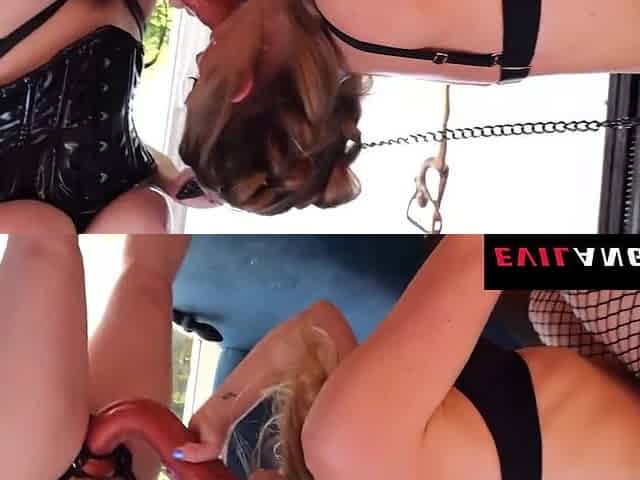 Slut gets overwhelmed by a giant dildo with her lesbian friends