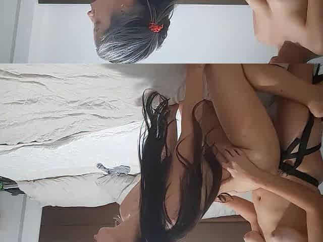 Giving a kiss with my neighbour on the bed, we take off our shirts and scissor