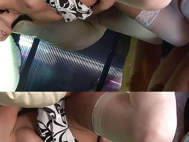 Pretty babes with colorful underwear get their pussies bounced on a leathered couch