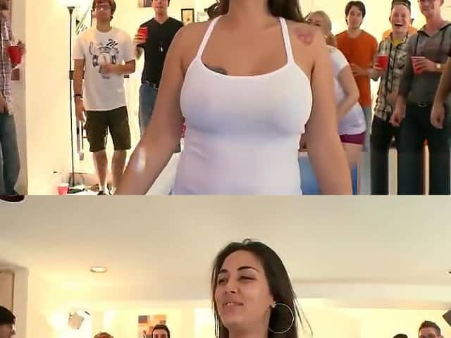 Beautiful brunette teen gets cum covered in bukkake orgy