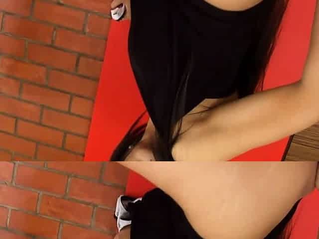 Breasty Oriental t-girl in blue pants strokes her tiny dick