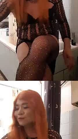 Transvestite Ah Qi "cute Shemale in Wide Sweater and Duck Shoes in Public Toilet"