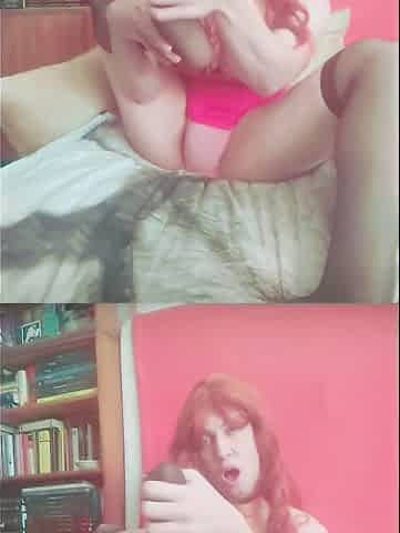 Redhead ladyboy in jean shorts enjoys solo masturbation in