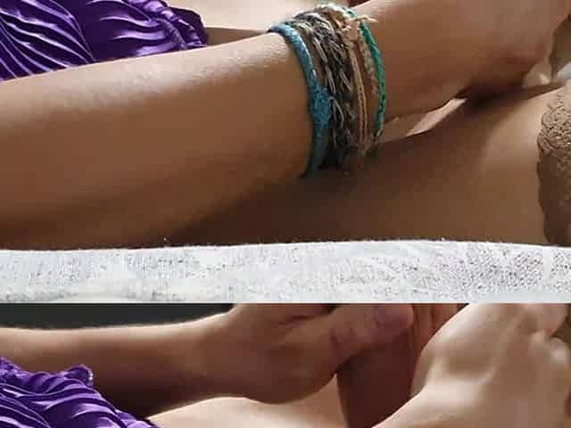 Brunette ladyboy in lace dress gets a hot cumshot on her