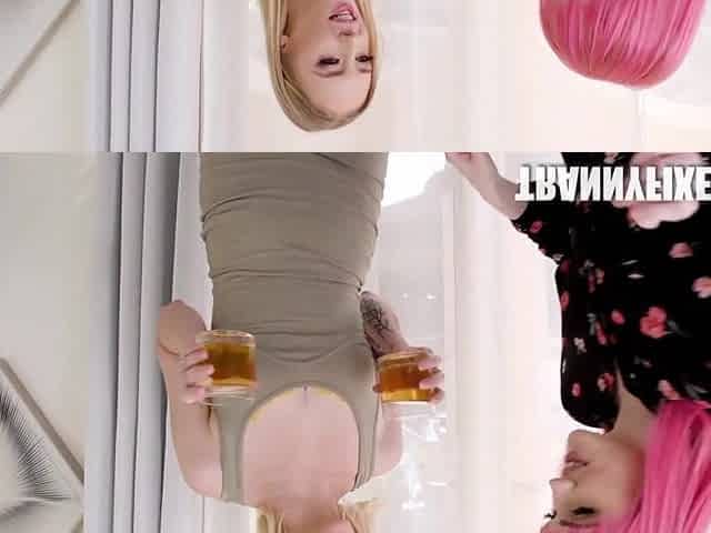 Teen 18+ Ladyboys Both Pissed On Their Big Lips And Sucking Cock Together