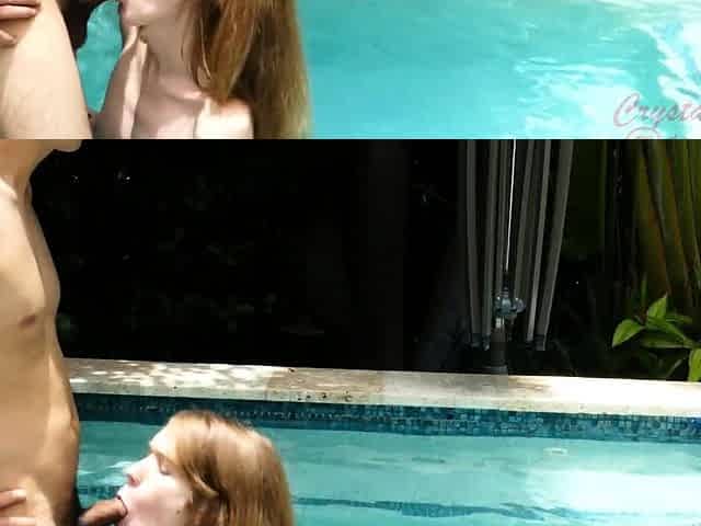 Redhead ladyboy with blue eyes gives her lover a blowjob in bathroom