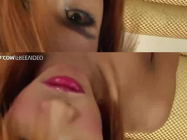 Red-haired ladyboy in a red dress sucks a huge load of sperm out of her