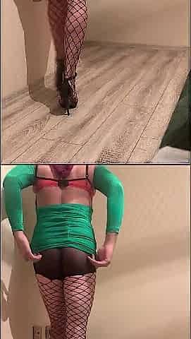 Breasty redhead ladyboy in white fishnet nylons jerks off solo
