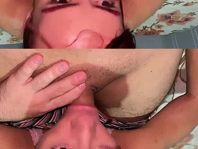 Busty ladyboy in lace panties gives her lover a blowjob in