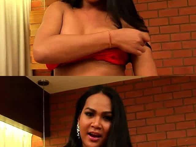 Chubby brunette ladyboy Wun teases with her big ass and