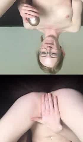 Small titted brunette Sharron with glasses masturbates
